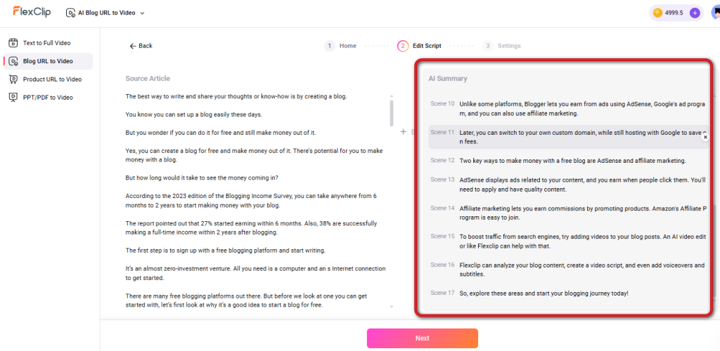 All you need to do is enter your blog post URL. Flexclip will analyse your blog content, extract the main points and turn it into a video script.