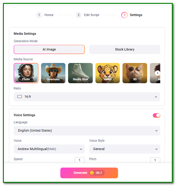 You may then add AI-powered, natural-sounding voiceovers and even generate subtitles for the video.